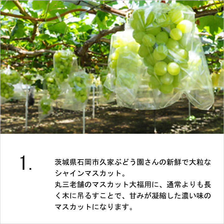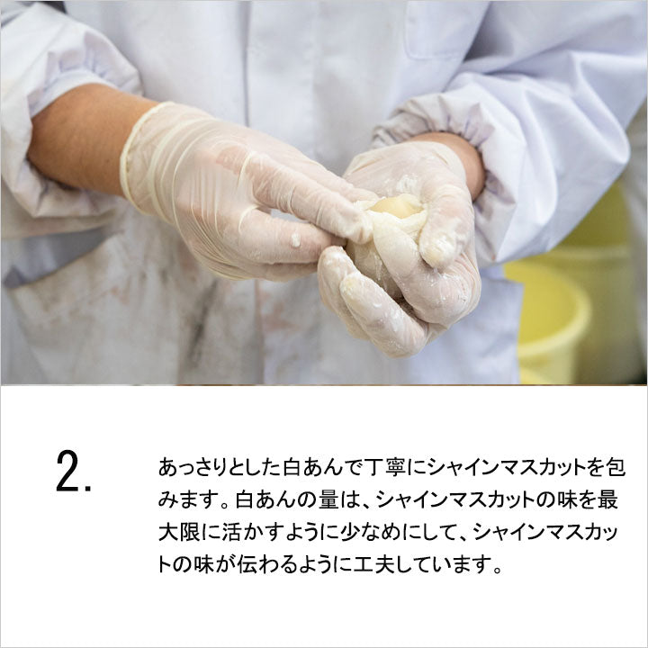 ■原材料名:シャインマスカット(茨城県産)、白餡、もち米(国産米)、砂糖、還元ミス雨/トレハロース、増粘剤(グルテン)、(一部に小麦・山芋・山芋を含む)