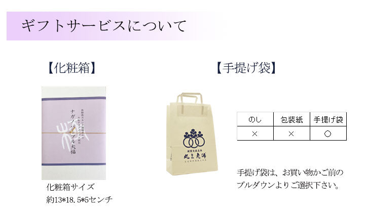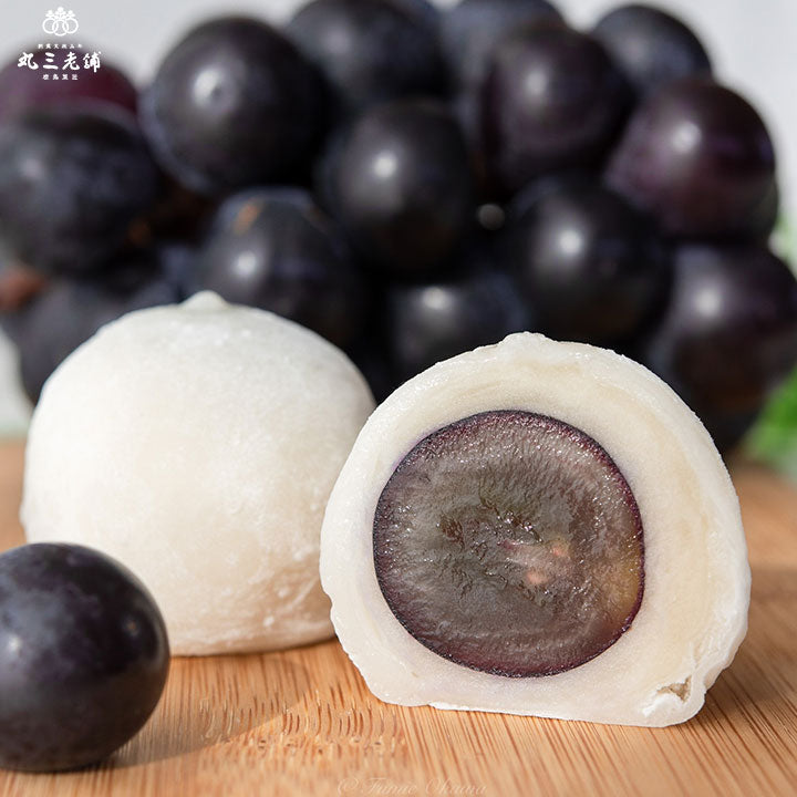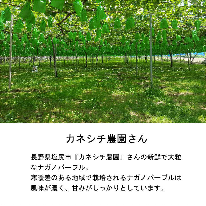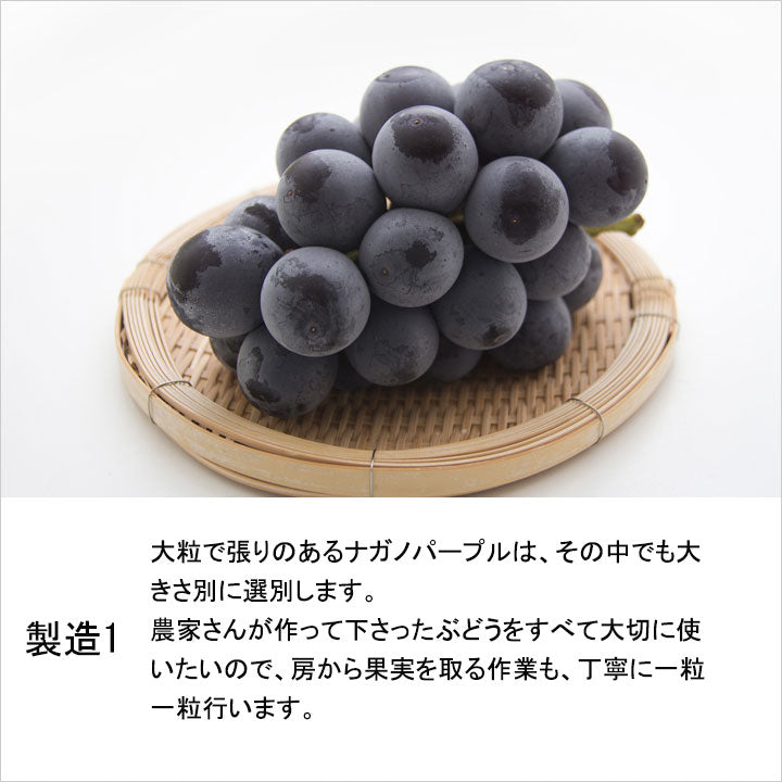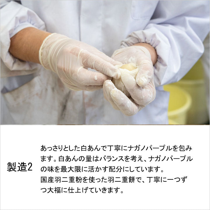 長野県塩尻市のカネシチ農園さんの丸ごと食べられるナガノパープルを使用しております。甘みがぎゅっと濃縮されたぶどうを白餡とやわらかなお餅でつつみます。特に大粒のプレミアムサイズです。