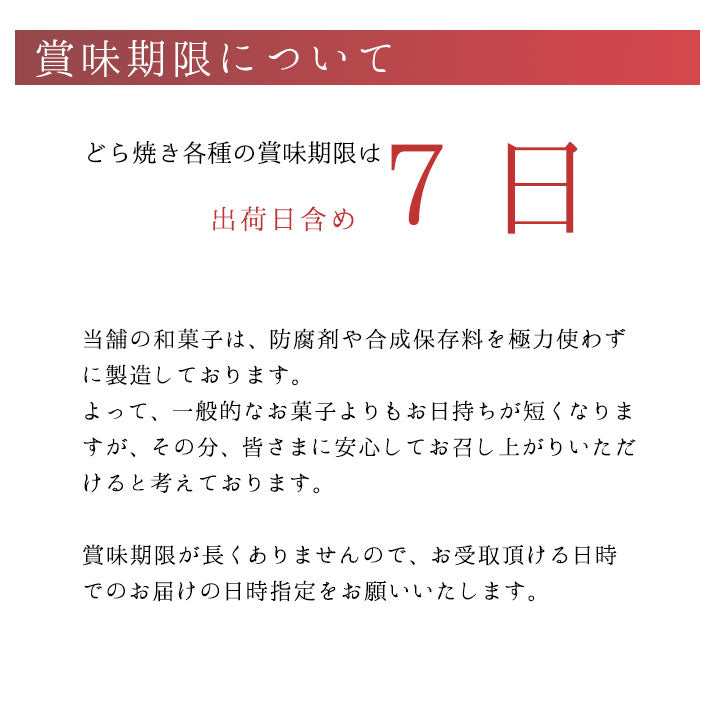 厳選小豆で職人が丁寧に炊き上げた粒あんを、ふかふかに焼き上げたどら焼き皮でサンドしました。8個入りは贈り物にも多くお使いいただいております。