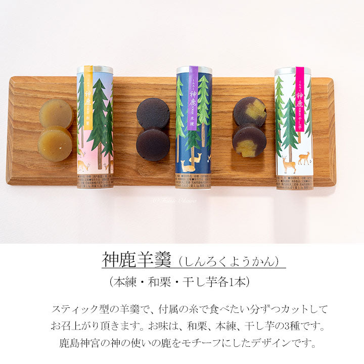 ■内容量:どら丸、はま栗、鹿嶋ろまん、ぼくでん餅、カステラ(ハチミツ)、カステラ(ショコラ)、神鹿羊羹(和栗)、神鹿羊羹(ほしいも)、神鹿羊羹(本練):各1個