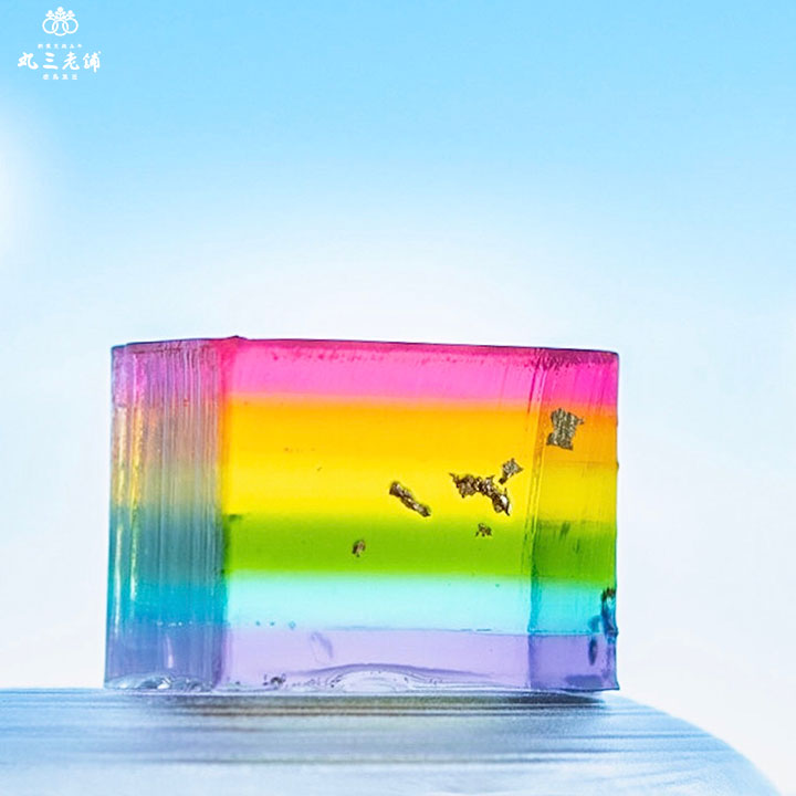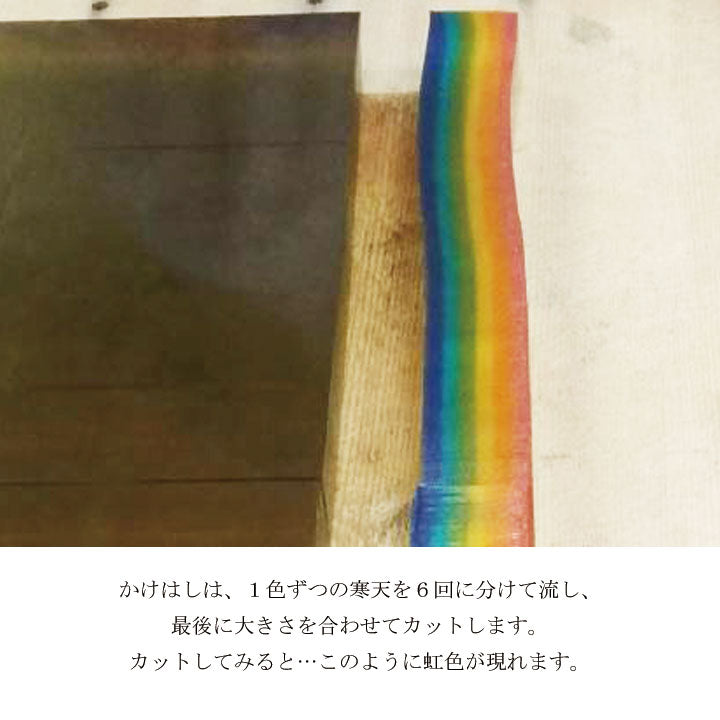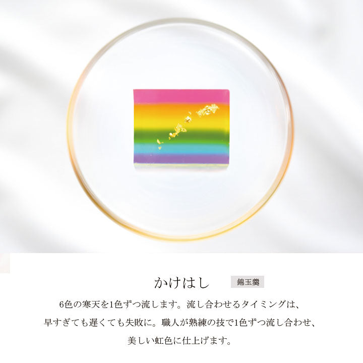 6色に輝く虹色スイーツは、うっとりするほどに美しい生菓子です。職人が1色ずつ6回に分けて流し合わせるお菓子は、タイミングが難しく職人技でもあります。