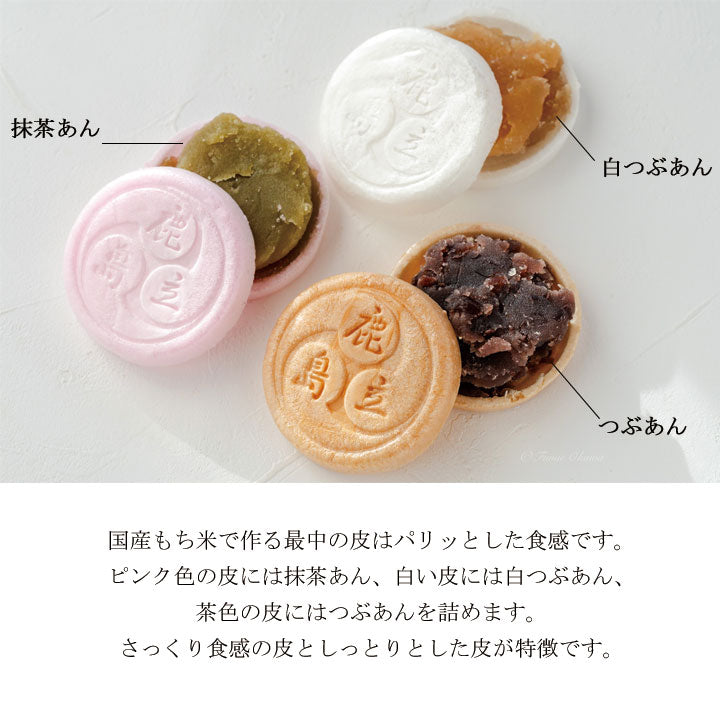 国産もち米で作るパリッとした食感の最中皮の中には3種のあんをたっぷりと詰めます。鹿島神宮の「祭頭祭」をイメージした化粧箱入りです。