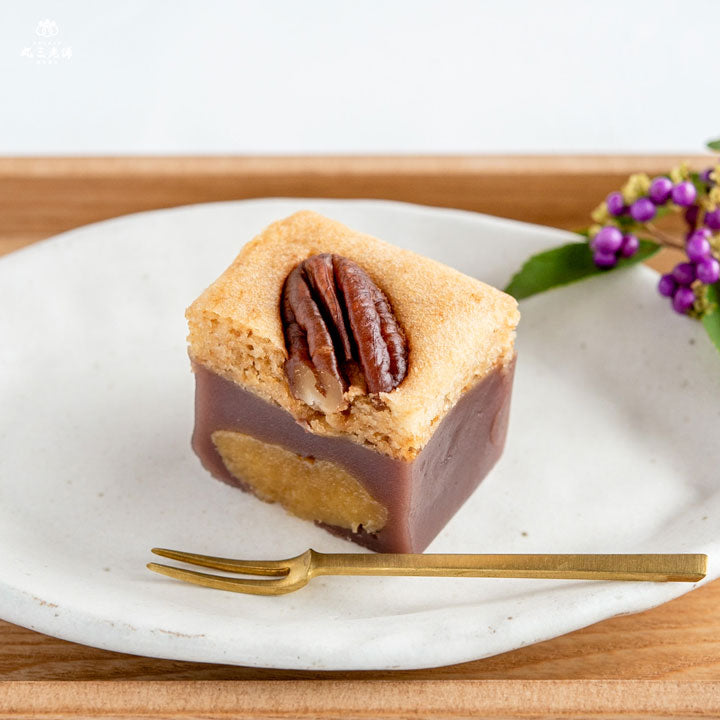 茨城県産の最高級干し芋「ベニハルカ丸干し」を使った蒸し羊羹と、キャラメル風味の浮島を流し合わせ、大粒ピーカンナッツをあしらったお菓子です。お試し用のカットでご用意しております。