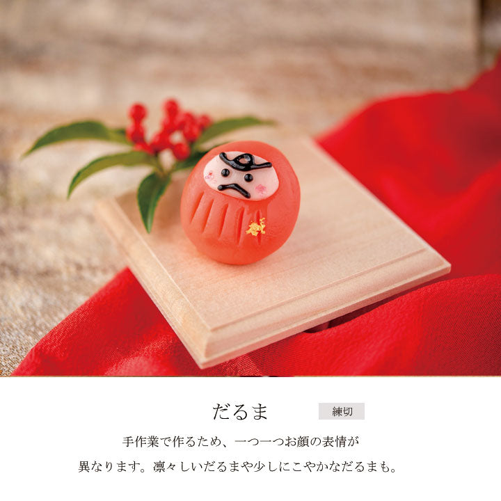 ・だるま:白餡、砂糖、小豆、還元水飴、山芋、もち米、寒天/トレハロース、金箔、着色料(赤3、赤105、黄4、炭末)、(一部に山芋を含む)