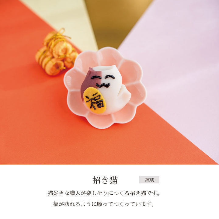 ・まねき猫:白餡、砂糖、小豆、還元水飴、山芋、もち米、寒天/トレハロース、着色料(炭末、赤2、赤102、黄4、青1)、(一部に山芋を含む)