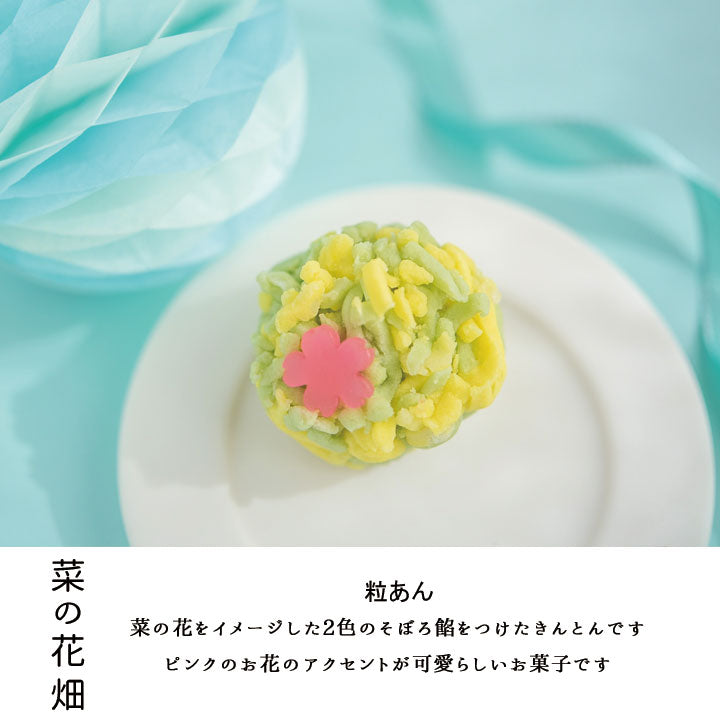 【菜の花畑(きんとん)】粒餡、白餡、大和芋、砂糖、還元水飴、トレハロース、着色料(赤3、赤105、黄4、黄5、青1、赤102)